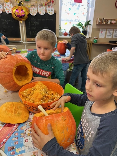 Čtvrtek byl hlavně o vykrajování, dlabání a zdobení dýní. Myslím, že se nám povedly krásné dekorační kousky.