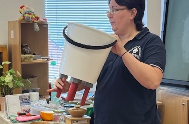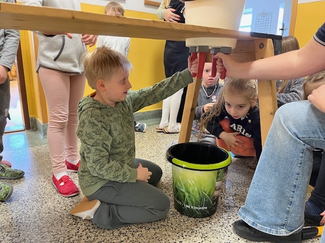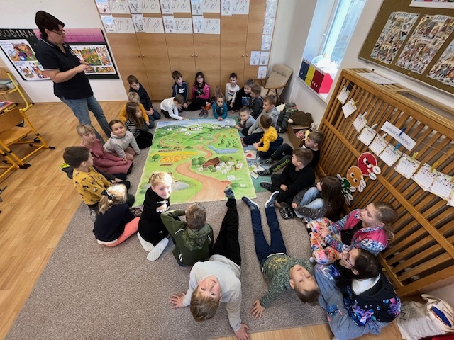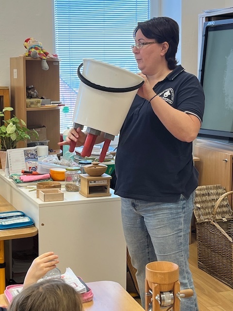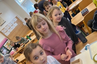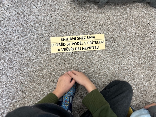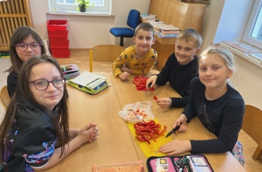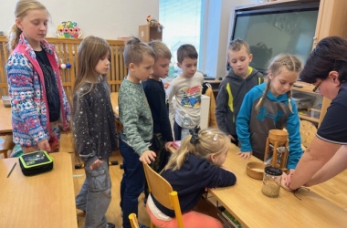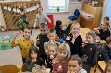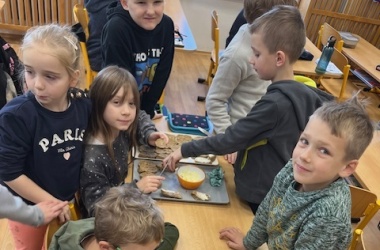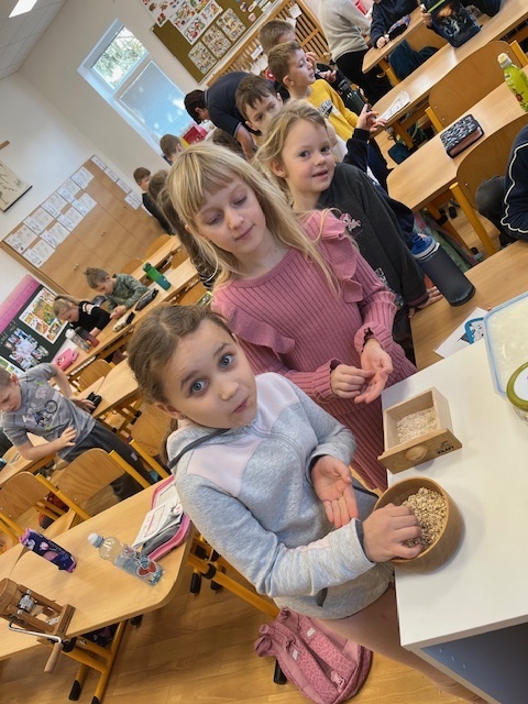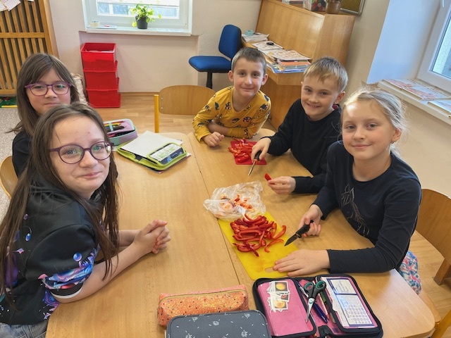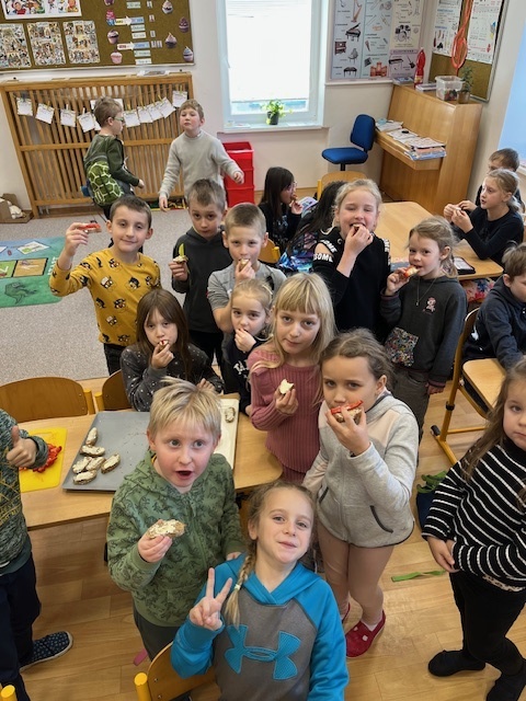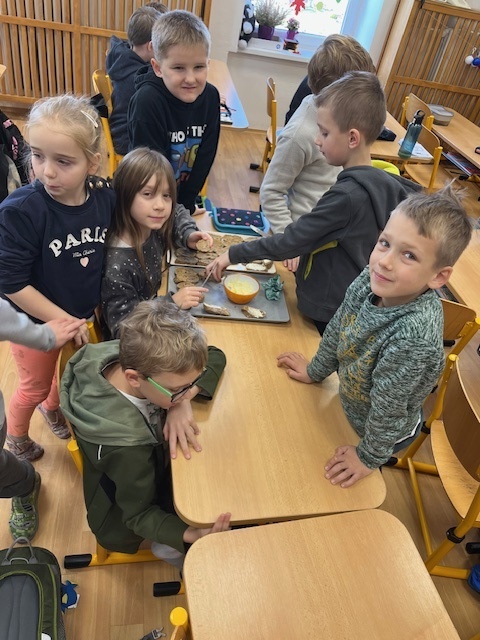 V úvodní části si žáci povídali o tom, co obvykle snídají, z čeho se skládá jejich jídelníček a jaké důležité složky musí každé jídlo obsahovat – tedy sacharidy, tuky, bílkoviny a také zeleninu. Poté si prakticky vyzkoušeli, jak vznikají některé běžné potraviny: tloukli máslo, „dojili krávu“ z které získávali mléko, z ovsa vyráběli vločky a ze žita mleli mouku. Na závěr nechyběla ochutnávka čerstvých baget s vlastnoručně utlučeným máslem a zeleninovou oblohou. Paní lektorka se s žáky rozloučila inspirativními příslovími o zdravé stravě a my jí tímto moc děkujeme za skvělý zážitek i nové poznatky.