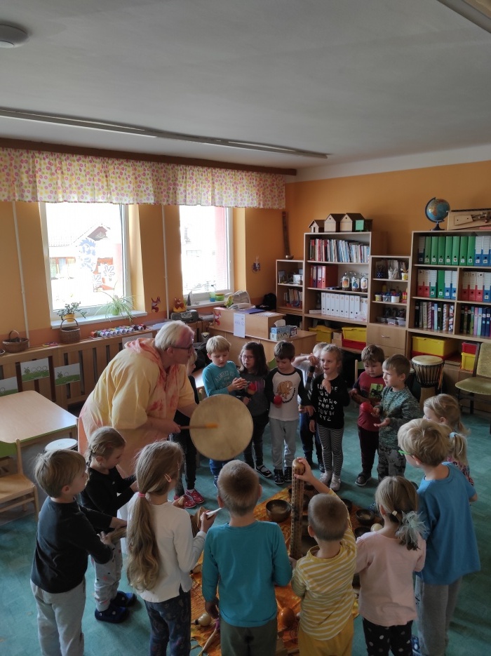 Dopoledne plné hudby a relaxace si pro nás připravila paní Mirka Veselá, která se dlouhodobě zabývá muzikoterapií. Zabubnovali jsme si na džembe bubny, zahráli na netradiční hudební nástroje a zatancovali písničku o zvířátkách.