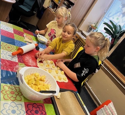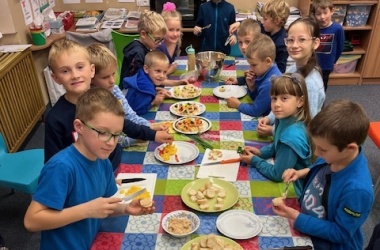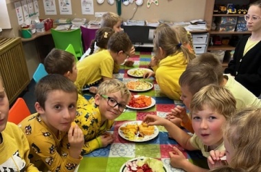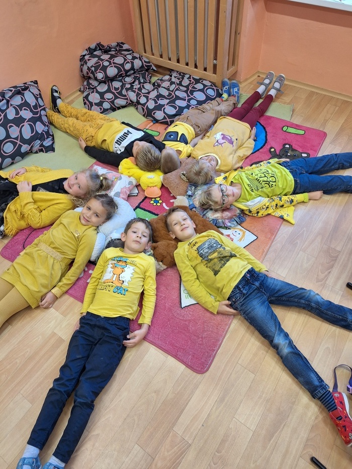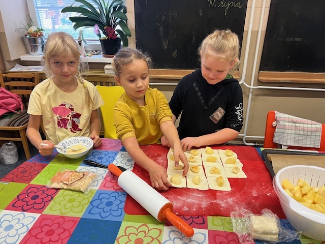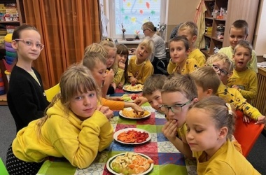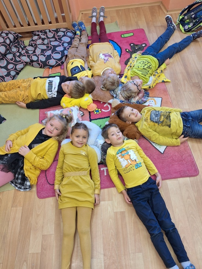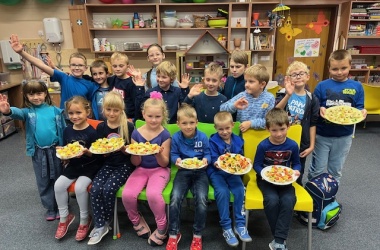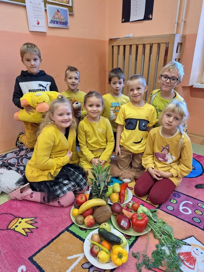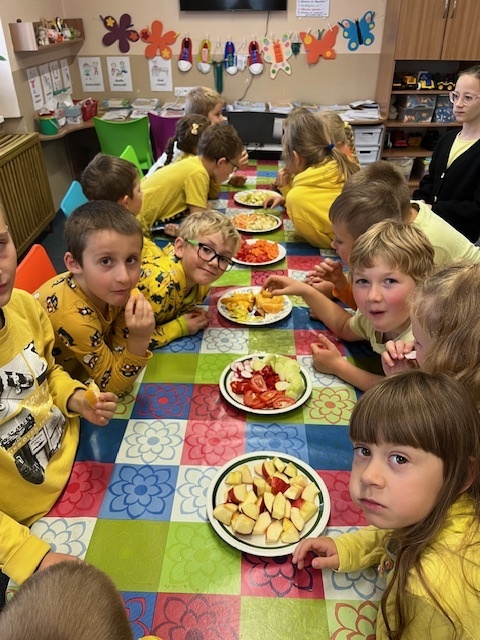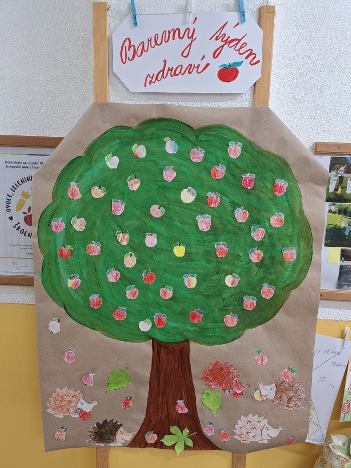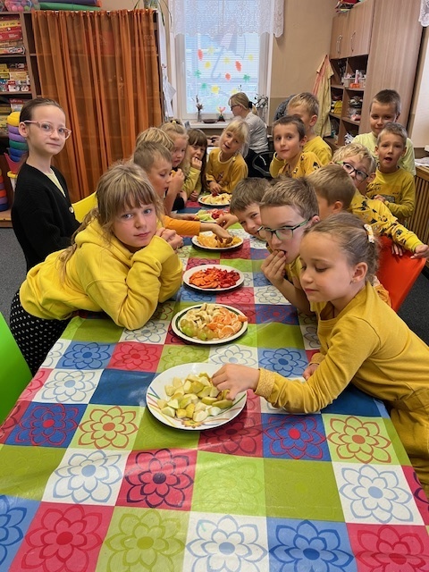 V rámci žlutého čtvrtku jsme ochutnávali přinesené ovoce i zeleninu, upečený štrůdl a ve školní družince jsme připravili jablka v županu. To bylo naše zdravé mlsání. Opět jsme si povídali o tom, co podporuje naše zdraví mimo sportovní aktivity a stravu - vzájemné, kamarádské vztahy, čistá příroda a sluníčko. To naši prvňáčci vytvořili.
