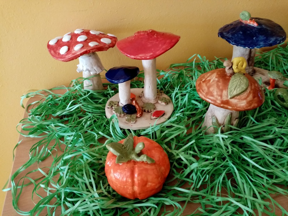 Letošní úroda hřibů nás inspirovala k netradičnímu podzimnímu tvoření. Keramické muchomůrky a hřiby různých druhů i tvarů, se opravdu povedly. A tvořili jsme i úplně nové neznámé druhy! Houbovou výstavu jsme doplnili i krásnými dýněmi a dekoračními předměty z podzimních keramických listů. Výrobky se opravdu všem povedly dokonale, velká pochvala!